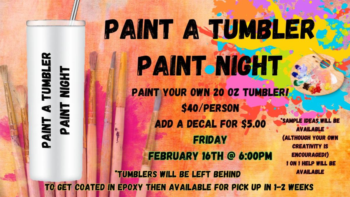 $40/person gets you a blank 20oz tumbler and open access to all studio tools to create your own one of a kind tumbler! Reference photos will be available for ideas, however your own creativity is encouraged! Add a decal for $5.00. I will be available for any one on one help needed! Cups will be ready in 1-2 weeks for pick up!